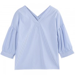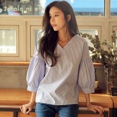 韩都衣舍韩版女装春装新款条纹显瘦百搭宽松v领七分袖衬衫潮 领券立减/单件包邮/七天无理由退换
